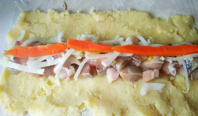 Бамбуковый коврик покрываем пищевой пленкой и равномерно раскладываем картофельное пюре, на него раскладываем порезанные овощи, яйцо, выдавить полоску майонеза, а поверх нарезанное филе сельди, всю селедку использовать не нужно, т.к. часть понадобится для украшения.
