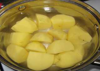 В кастрюлю выкладываем подготовленный картофель, заливаем водой, добавляем соль, доводим до кипения, уменьшаем огонь и варим до готовности, примерно 20-25 минут.