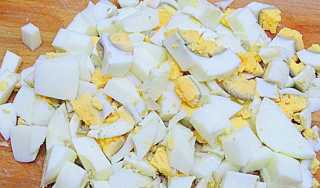 Яйцо отвариваем в подкисленной воде до готовности – в течение 15 минут, охлаждаем и крошим средними кусочками.