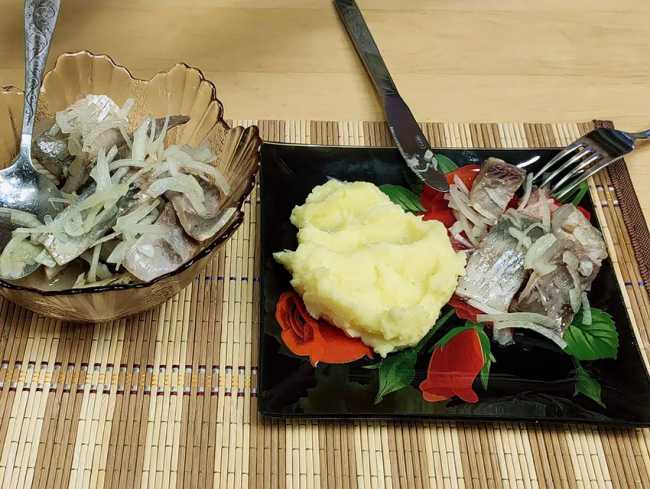 Обычно, селёдку кушают с картофельным пюре, а можно её кушать как самостоятельное блюдо.