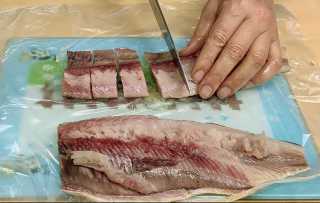 Разбираем тушку на филе, вынимаем все кости и снимаем кожу.
