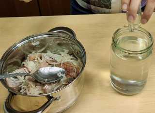 В банку с холодной водой выливаем 70% уксус, заливаем селедку, перемешиваем, и пробуем рассол, если он не солёный, то его можно слегка подсолить, содержимое кастрюли перемешиваем.