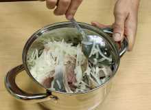 Отправляем лук в кастрюлю с рыбой, массу перемешиваем.