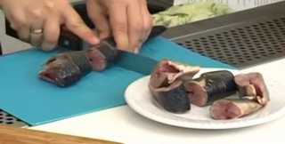 У рыбы удаляем: голову, внутренности, хвост, промываем её водой и нарезаем на кусочки в 2-3 см.
