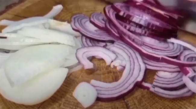 Репчатый лук, очищаем от шелухи, промываем водой и шинкуем тонкими полукольцами. Для приготовления блюда можно взять лук нескольких сортов.