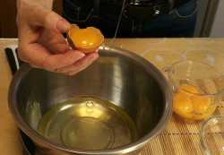 В отдельную миску разбиваем яйца, при этом будем использовать только белки. Добавляем всю соль и начинаем их взбивать сначала на медленном огне, а затем скорость увеличиваем до средне.