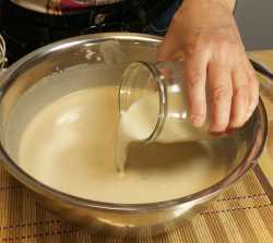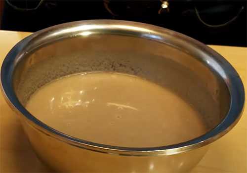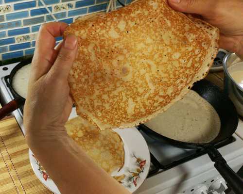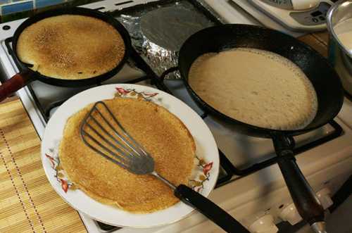 Внимание: Если у вас сковорода нуждается в смазывании, то перед каждой выпечкой блинов сковородку нужно смазывать маслом. Можно наколоть на вилку кусочек сала и каждый раз им протирать сковородку, также перед каждой заливкой тесто нужно перемешивать в миске.