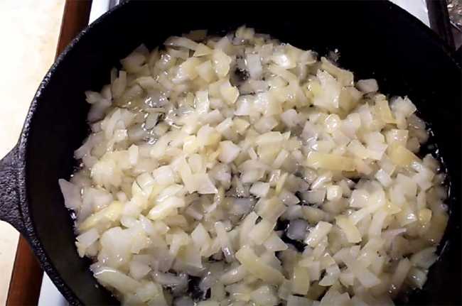 Репчатый лук, очищаем от шелухи, промываем водой, шинкуем средними кубиками и обжариваем на растительном масле до золотистого цвета.