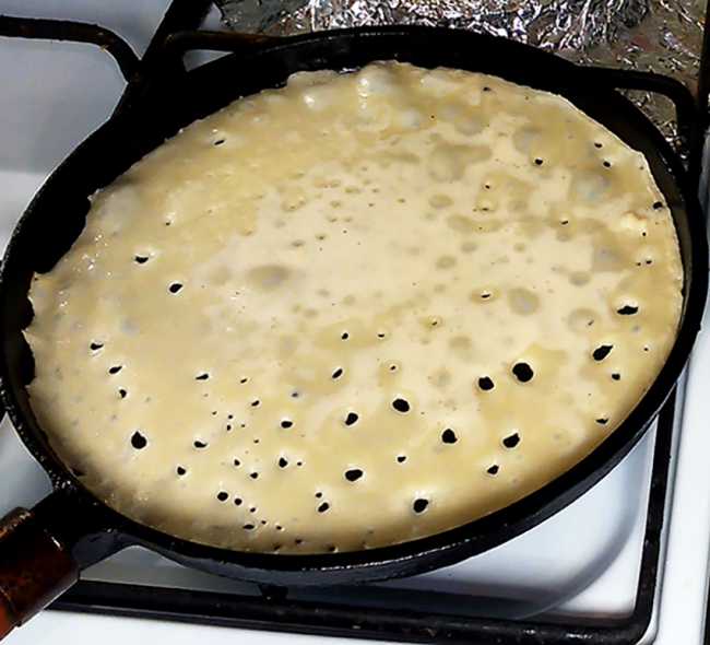 Жарим блин 1,5-2минуты, на сильном огне, переворачиваем и жарим другую сторону только 1 минуту, так поступаем со всеми блинами.