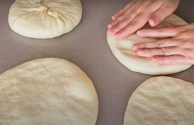 Отдельно формируем лепешку, на неё укладываем узелок с картошкой, пимпочкой вниз, складываем лепёшку в виде конверта, переворачиваем и руками распределяем тесто, формируя из него лепёшку по размеру сковороды.