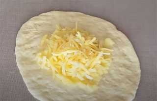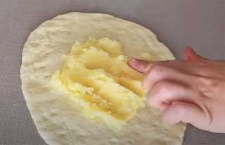 На раскатанную лепёшку укладываем одну часть картофельного пюре и одну часть сыра, собираем лепёшку в узелок.
