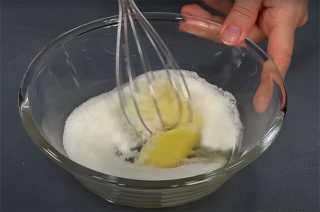 В миску разбиваем два куриных яйца, сахар и слегка взбиваем – пока масса не побелеет. Перед приготовлением начинки куриные яйца не забываем хорошо промыть водой.