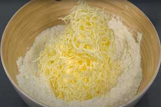 Ингредиенты перемешиваем, достаём сливочное масло из морозилки и очень быстро натираем на крупной тёрке прямо в сыпучий состав.
