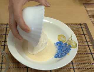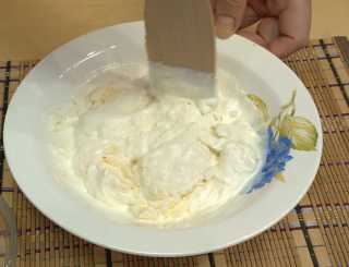 Манку высыпаем в миску, заливаем её сметаной, перемешиваем и отставляем в сторону на 10-15 минут – пусть набухнет.