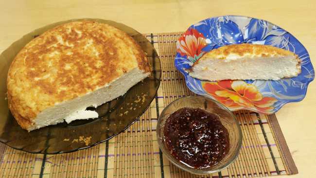 Запеканка осела по сторонам, приобрела единую форму, пора её вынимать из кастрюльки и подавать к столу.