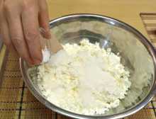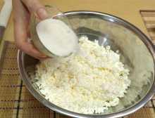 Творог перемололи до однородного состояния, добавляем в него: сахар, соль и перемешиваем.