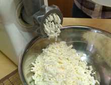 Творог пропускаем через мясорубку, можно его перетереть сквозь сито или измельчить при помощи блендера.