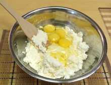 Добавляем яйца куриные, которые предварительно нужно помыть водой, и тщательно их перемешиваем с творогом.
