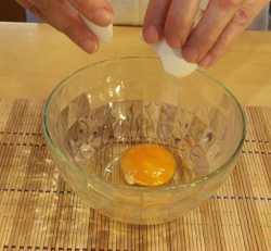 В отдельную миску разбиваем промытые куриные яйца и взбиваем до лёгкой, белой пены, при помощи миксера или венчика.