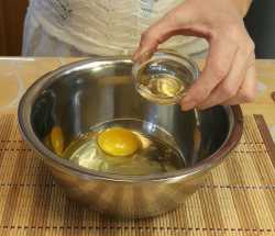 Куриные яйца, промываем водой, разбиваем в миску, добавляем коньяк, слегка взбиваем вилкой и отставляем в сторону.