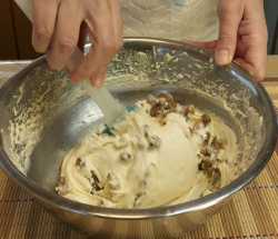 Тесто взбили, оно получилось гладкое и эластичное, добавляем изюм – аккуратно перемешиваем.