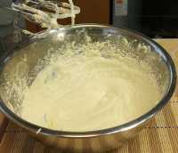 Массу взбили, добавляем: соль; разрыхлитель теста и частями просеянную муку, по 1 ст. ложки, каждый раз взбиваем тесто до полного растворения муки.