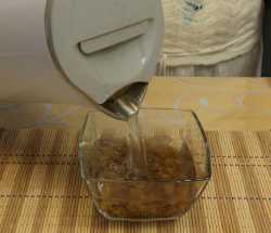 Первым делом, займемся изюмом. Его промываем водой, выкладываем в миску, заливаем кипятком и выдерживаем 5 минут.