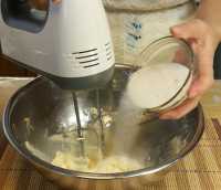 По истечении времени, постепенно в масло добавляем сахар и продолжаем взбивать в течение 5-7 минут.