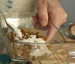 Затем воду сливаем, изюм просушиваем, пересыпаем 3 ч. ложками муку и пока отставляем в сторону.