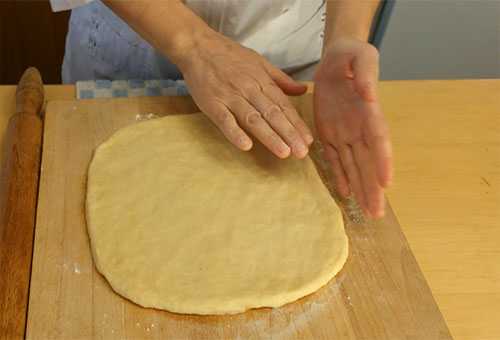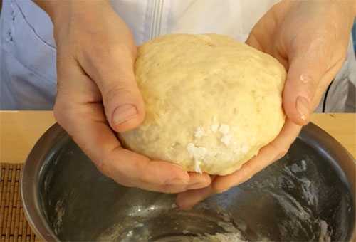 Сначала перемешиваем при помощи ложки, а затем продолжаем вымешивать руками. Тесто должно получится средней консистенции и не липнуть к рукам. Получается, что в процессе вымешивания, если тесто липнет, к нему нужно будет добавить немного муки.