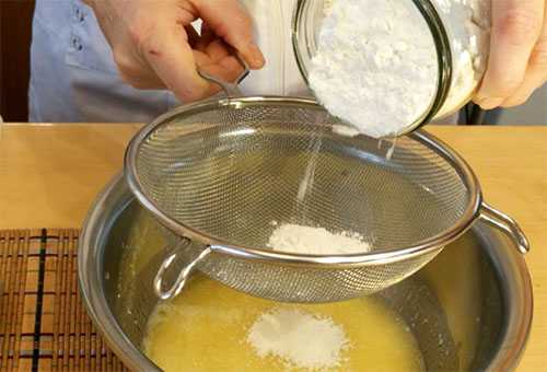 В просеянную муку добавляем разрыхлитель теста, перемешиваем и высыпаем в миску к жидким ингредиентам – перемешиваем.