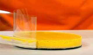 В форму для запекания вставляем ацетатную пленку, но прежде форму нужно сбрызнуть водой, для лучшего прилипания пленки. Если нет возможности приобрести такую пленку, то можно простелить форму пищевой плёнкой.