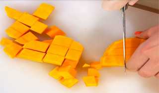 Тыкву нужно очистить от кожуры, промыть водой и нарезать кубиками 2 на 2 см.