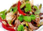 Рецепт приготовления салат из языка, мяса и грибов. Состав: язык 200 гр., ветчина 200 гр., курица 200 гр., грибы 300 гр., столовый 5% уксус 1 ст.ложка, горчица 1,5 ст.ложки, масло подсолнечное 2 ст.ложки, чёрный молотый перец, соль по вкусу.