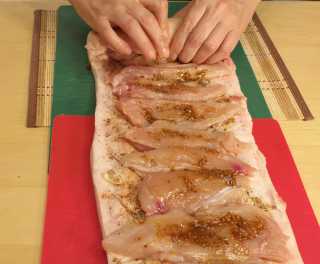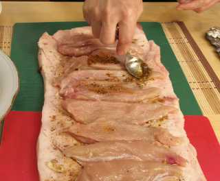 Кожу со специями разворачиваем, филе курицы смазываем с одной стороны маринадом и эту сторону кладём на сало.
