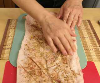 Специи и чеснок хорошо втираем в поверхность и в разрезы сала.