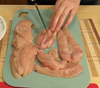 Грудку освобождаем от кожи, кости и нарезаем её на тонкие полоски, примерно в 0,5 см.