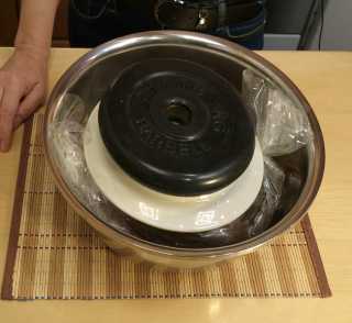 Время запекания закончилось, вынимаем рулет из духовки и не вынимая из рукава кладём его в миску, накрываем тарелочкой, а затем придавливаем грузом, у меня груз в виде блина от гантели, и оставляем на столе на 4 часа – пусть остынет.