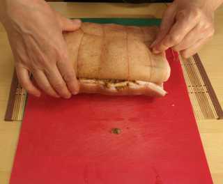 Рулет свернули, фиксируем его кулинарной нитью со всех сторон и с боков.
