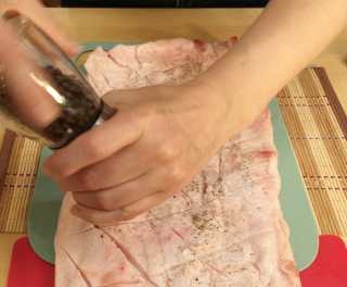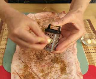 Поверхность посыпаем солью, черным молотым перцем, специями для мяса и натираем чеснок на средней тёрке.