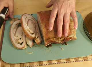 Сутки прошли, вынимаем рулет свинина, протираем его бумажным полотенцем, удаляем нитки и нарезаем пластиками.