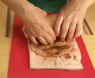 Только грудку на 3 см не докладываем до краёв кожи, для удобства скручивания рулета.