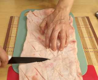 Кожу берём с небольшой прослойкой сала, примерно не более 1-1,5 см, при помощи ножа, по всей поверхности делаем лёгкие надрезы в виде сеточки.