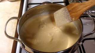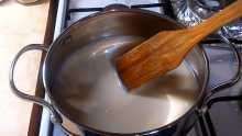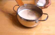 Ставим кастрюлю на плиту, включаем сильный огонь и ждём, когда появится первая пенка, при этом не забываем постоянно перемешивать молоко.