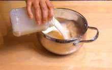 В кастрюлю (с толстым дном), наливаем стакан воды и слегка ополаскиваем кастрюлю, считается, что эта процедура предотвратит подгорание молока.