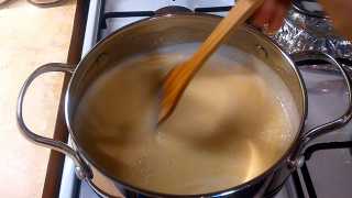 Через 2 минуты, крупа начинает загустевать, уменьшаем огонь до среднего и продолжаем варить, напомню, что готовлю на средней конфорке.