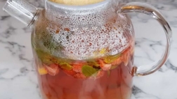 Чай, фруктовый с клубникой, виноградом, лимоном и мятой.