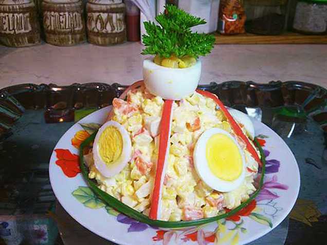 Читать далееСалат с крабовыми палочками, кукурузой, огурцом и яйцом.