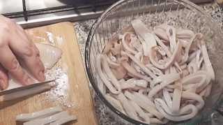Подготовленных кальмаров нарезаем кольцами, в 0,7 см.