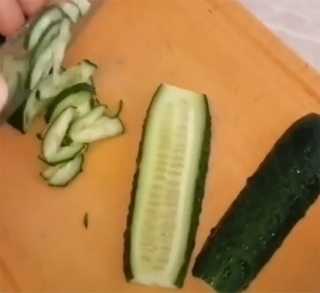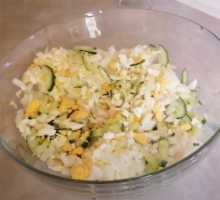 Огурец свежий, промываем водой и не снимая кожицы нарезаем такими же кубиками, как и яйца, выкладываем в миску.